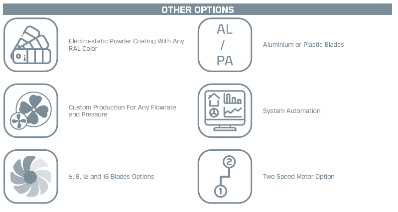 - Impeller with high efficiency airfoil blades in plastic material and hub in die cast aluminum alloy. Variable pitch angle in still position.